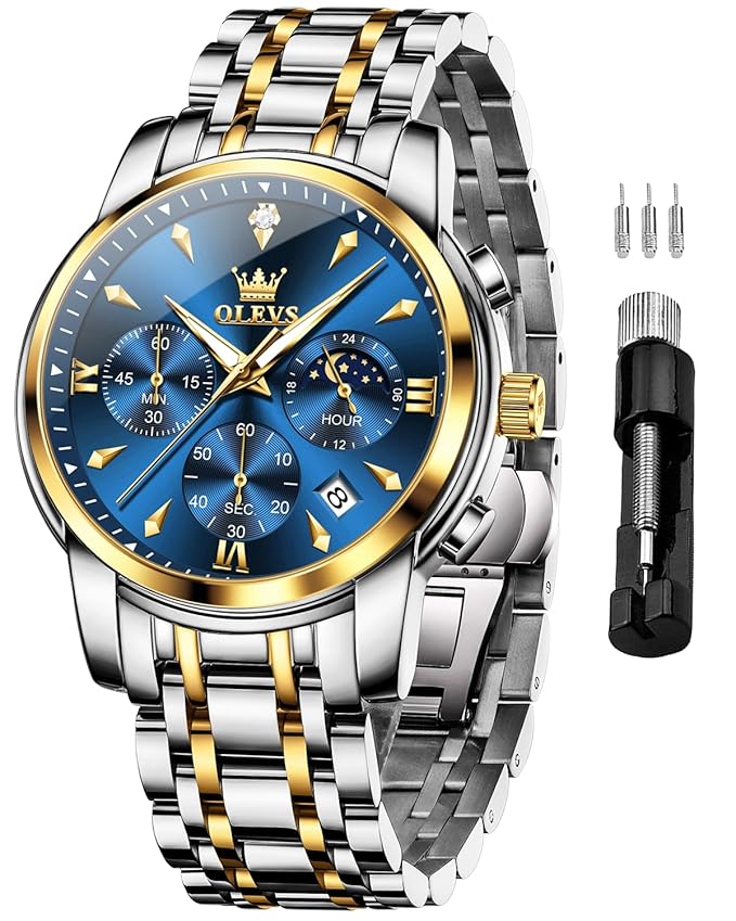 OLEVS Watches for Men Original Chronograph Luxury Business Analog Quartz Watch Waterproof Moon Phase Stainsteel Steel Diamond Mens Watch